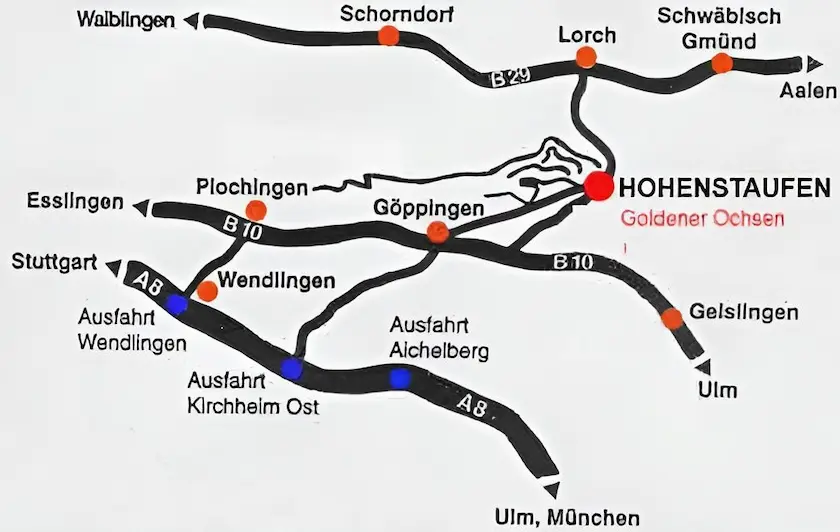 Sie erreichen uns bequem mit der Buslinie 933, die vom Göppingen Busbahnhof (ZOB) direkt zur Haltestelle Rathaus / Dorfplatz Hohenstaufen fährt. Die Haltestelle liegt nur wenige Meter von unserem Hotel entfernt.