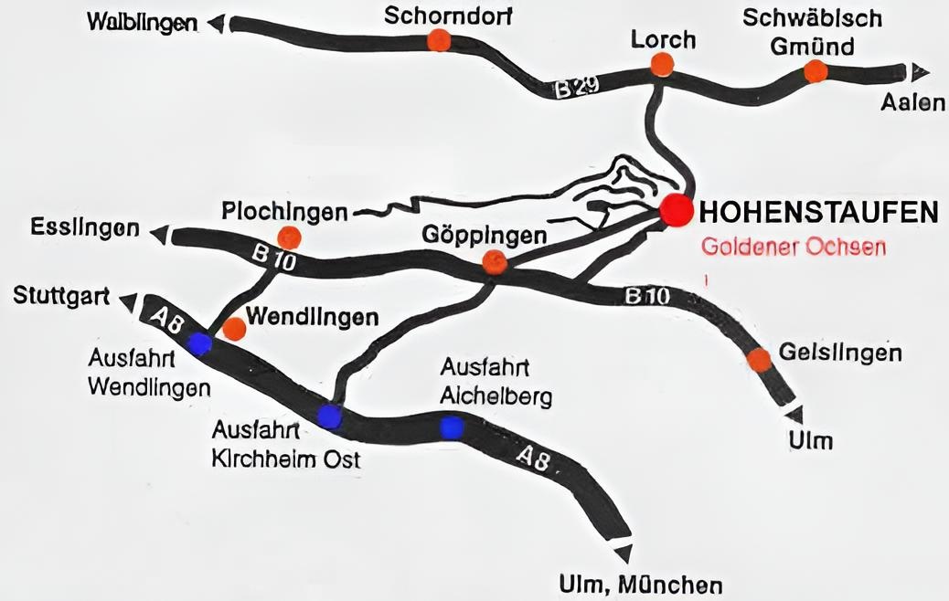Puede llegar fácilmente con la línea de autobús 933, que va desde la estación de autobuses de Goeppingen (ZOB) directamente a la parada Rathaus / Dorfplatz en Hohenstaufen. La parada está a solo unos metros de nuestro hotel.