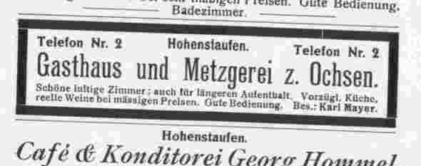 Eine Quittung aus dem Jahr 1909 belegt, dass der Gasthof "Ochsen" unter Karl Mayer eine Bierlieferung erhalten und bezahlt hat.